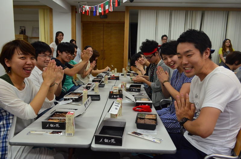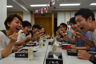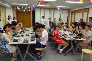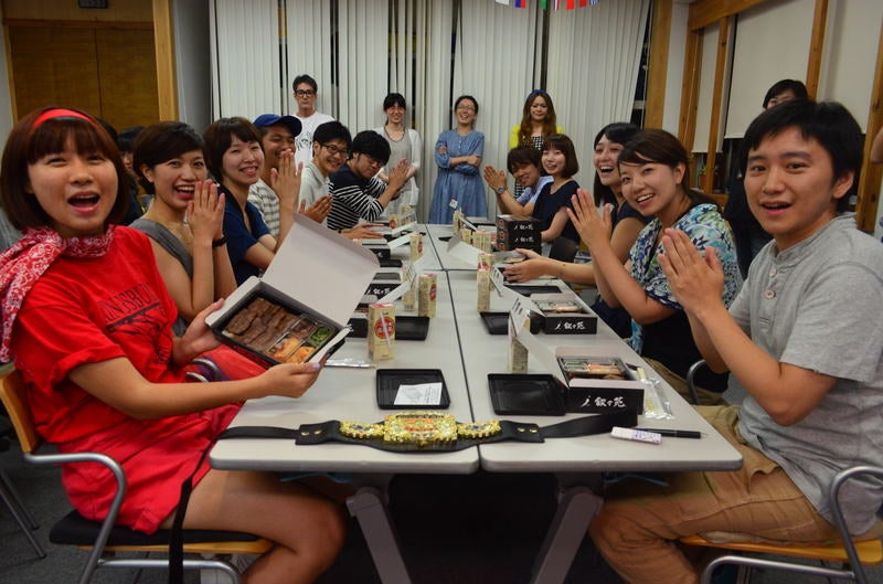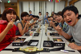 きれいに並べ終わりまして、ガチで、ヤングチームだけが席につきまして、アダルトチームはそれを囲んで立ちまして。「せーーーの!」「いっただっきまーーーす!」「いっただっきまーーーす!」「めしあがれ」「めしあがれ」「うっ、うまーーーーい!」「うまーーいぞーーー!」「おいしそう‥‥」「おいしそう‥‥」おめでとう、ヤングチーム。つぎがあるさ、アダルトチーム。