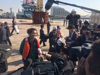 囲み取材を受ける
