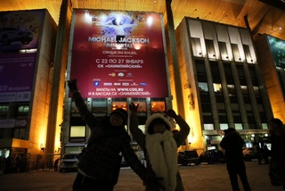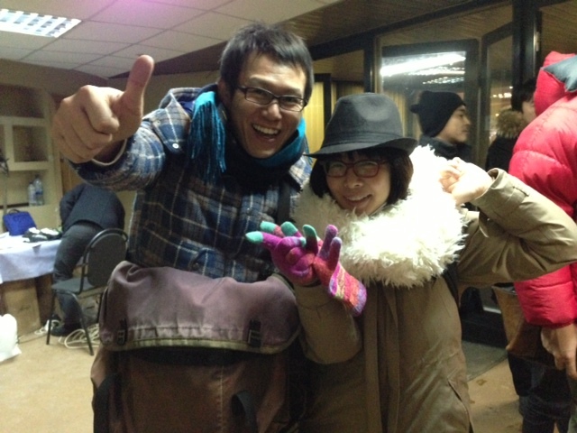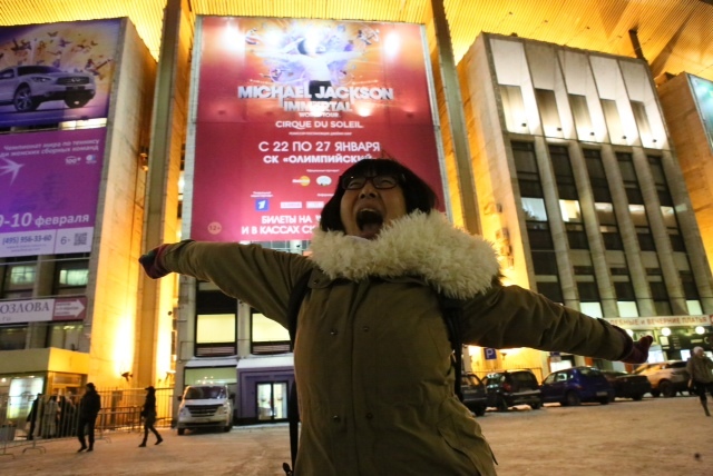 会場につきました。ここはもとオリンピックのアリーナ会場だったところのようです。Hooooo、マイコー!!■■■■■■■■■from TOKYOより氷点下10度以下の場所では外気を吸い込んだとたん凍って痛いから、なるだけマスクなどを用いよ、というアドバイスを受けていたはずなのにその、全開具合は‥‥。まぁ、そのテンションや、よし!