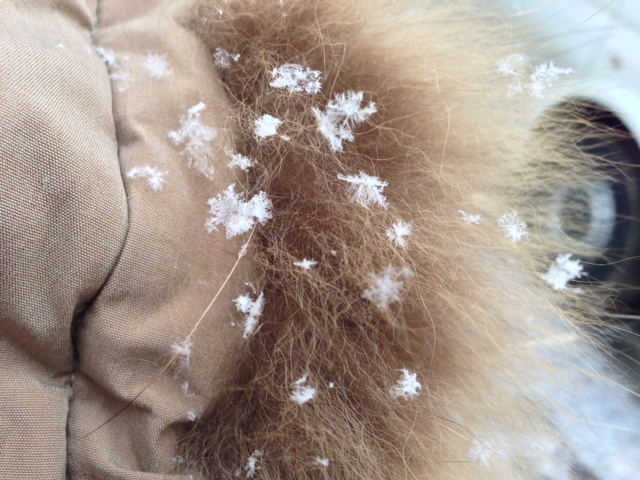 雪が結晶のまま溶けません。菅野のフードについた雪がめるへん。