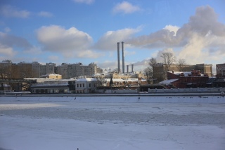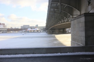 川が凍ってるよ。ガチゴチに。今日は晴れて青空なので、雲や、景色がすごくきれいです。川が凍るって、すごいね。スケートとかするのかな。