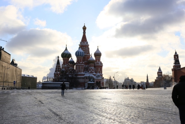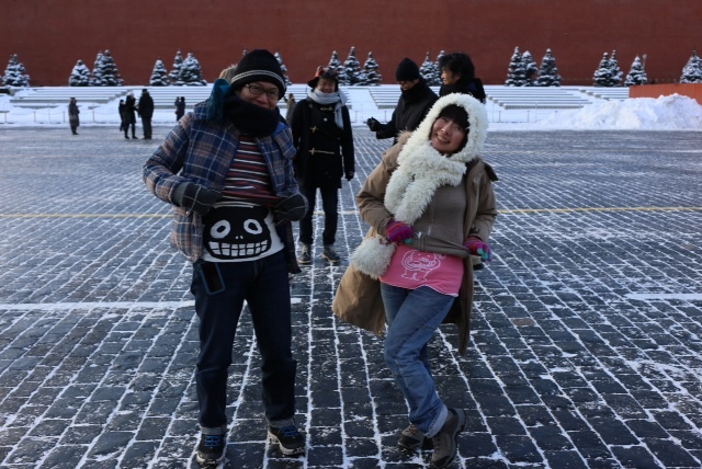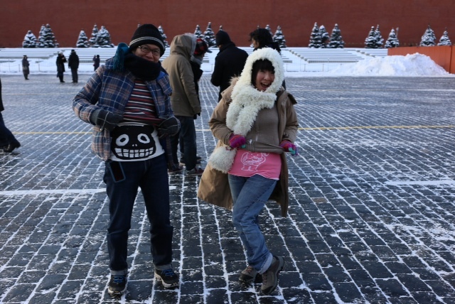 赤の広場にやってきました。じつはこの取材旅行中、我々は「ほぼ日ハラマキ」にお世話になってきました。わたしは夏用素材のハラマキだったのですが、あたたかい室内でもむれずに快適でした。上着のほかは、ふたりとも2枚しか着ていません。おなか、あたためてくれてアリガトー。
