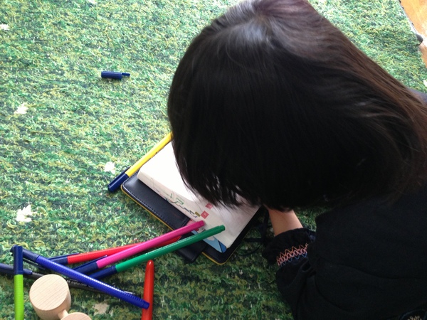 (しこしこと、寝転んで一生懸命に手帳に向かう娘)