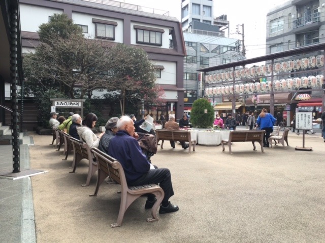 地蔵尊の敷地内にある、ベンチが並んでいるスペース。