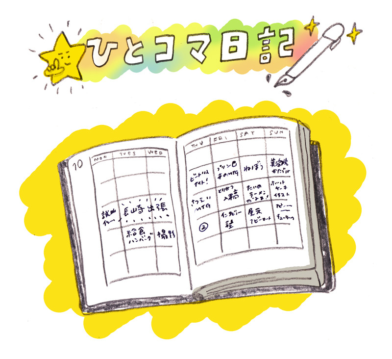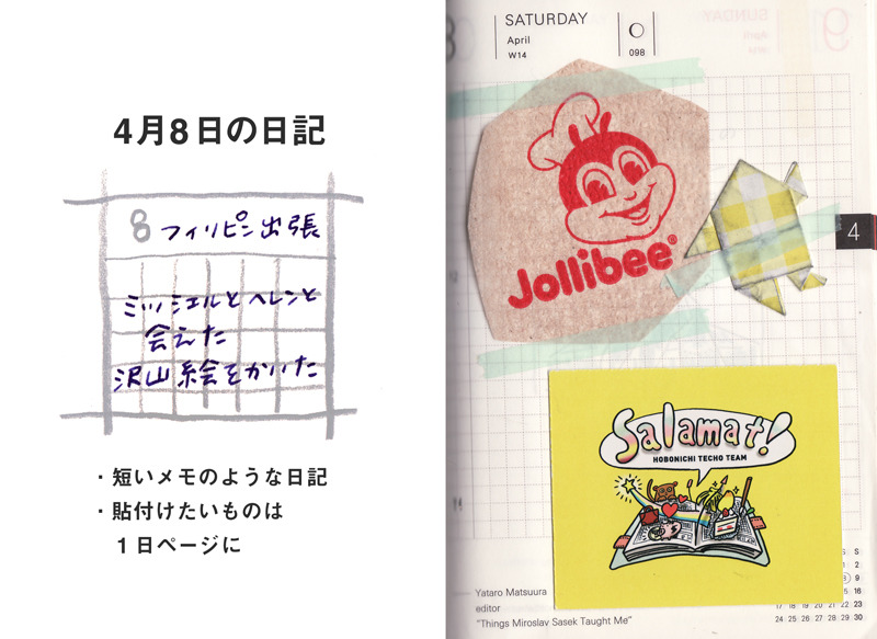 フィリピン出張の日の日記。空港でもらったカエルや、むこうのファストフードの紙ナプキンをペタリ。
