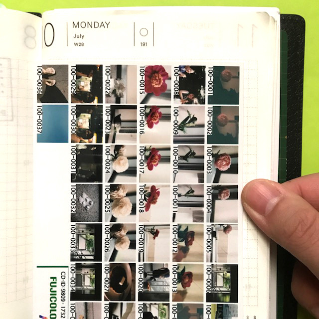 現像したフィルムの一覧表。箸袋、ショップカード、チケット、なんでも貼っておきます。