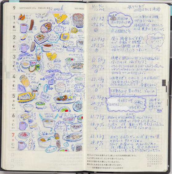 左ページには食べたもののイラストを描き、