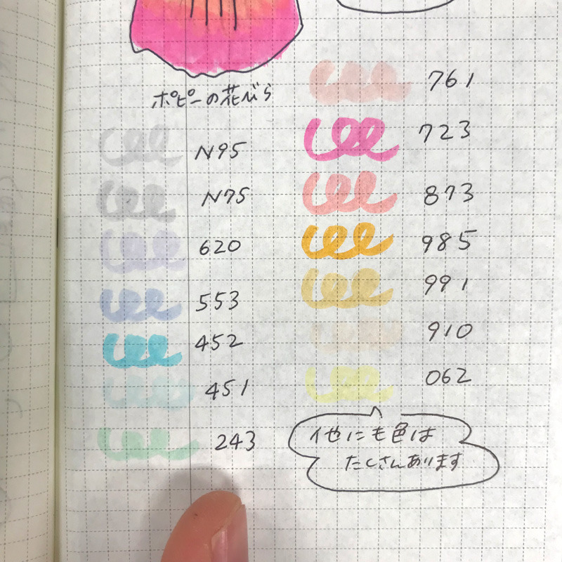 △わたしの持っている色リスト。写真にうまく写らないくらい、繊細で淡い色味もあります。