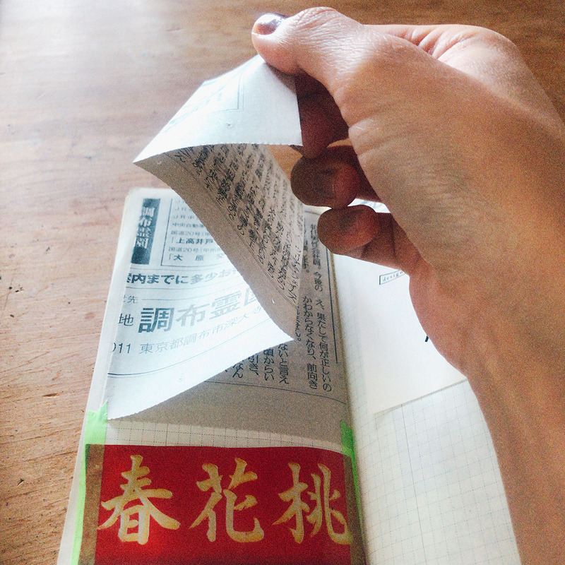 ▲大きな新聞記事は折りたたんで貼ります。