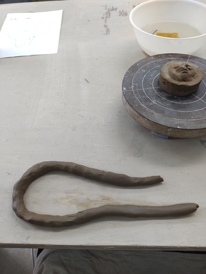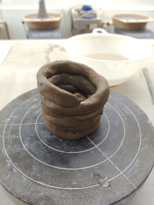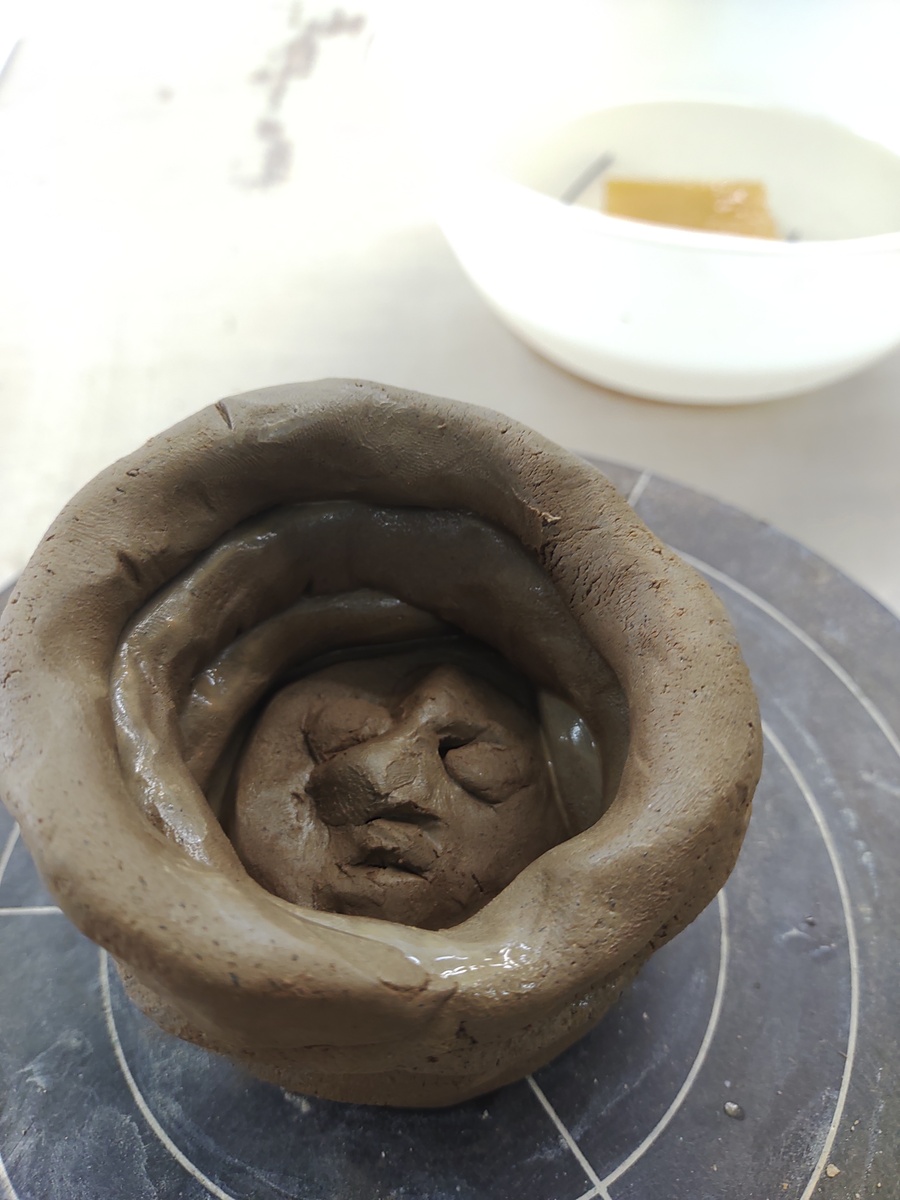 ひも状の粘土を、底の縁に合わせて、