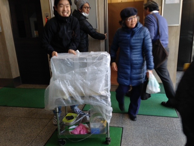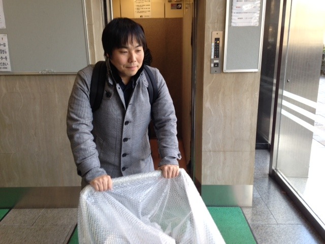 今、エレベーターで降りました。