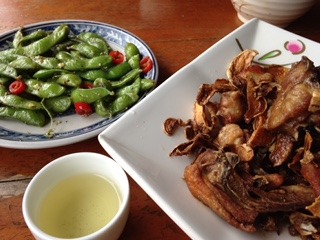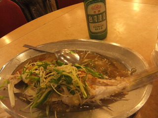 写真は熱炒のエビと魚の蒸し物、お茶を使った鶏肉料理、