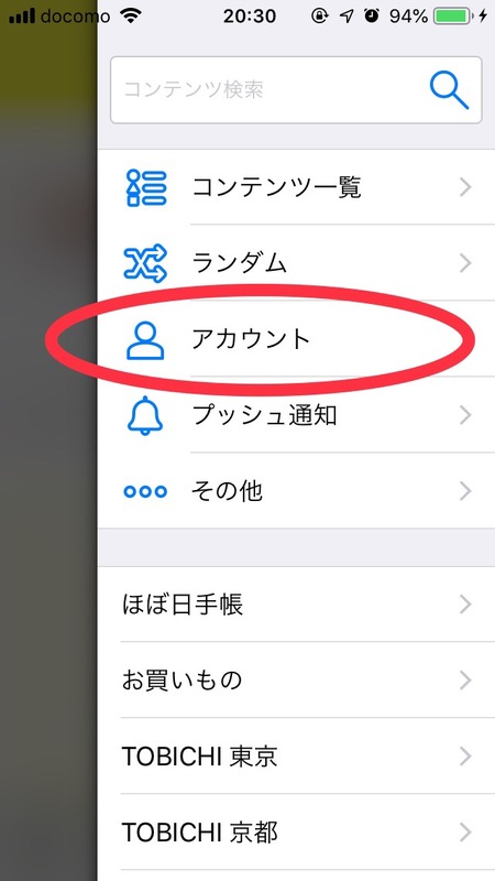 1. アプリの「メニュー」をタップし、「アカウント」をタップ。