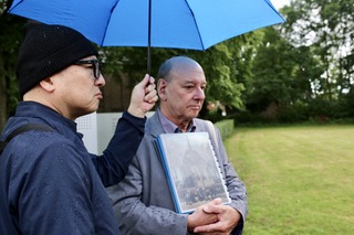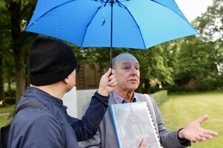 ガイドさんにそっと傘を差し出す、