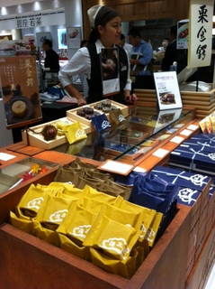 はや30分経過しましたが まったく心決められないままでおります。 どうしよう。 目にはいるのはスイートポテト、 大学芋とか 自宅持ち帰り用のデザートばかり。 やっと買えたのは栗きんとん一つだけ。 そこに榮太郎さんの限定の おいしそうなきんつばを見つけて おみやにしようか悩んでおります。