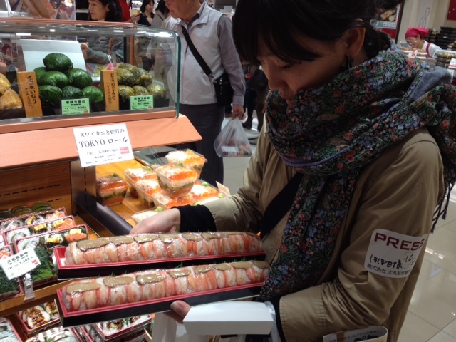 36cmあるという ズワイガニと松茸の TOKYOロールを買うと心に決めた 外山真理子。 どちらの松茸が大きいかで 真剣に悩み中。 |