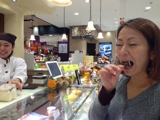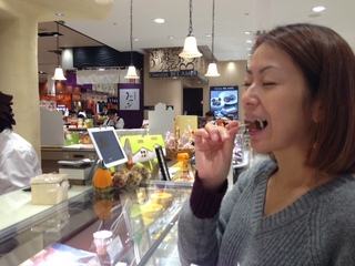コイケがスイーツを試食しています。 ラテールセゾンのふわふわした ケーキです。名前を失念しました。 やさしい甘さのケーキです。