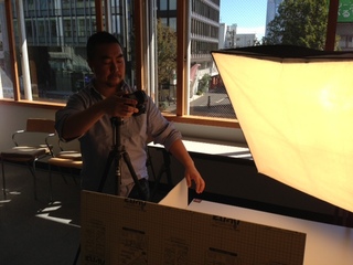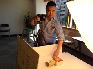 会社に戻ったら、 撮影です。 カメラマンはこの人、 弊社の食いしん坊カメラマン、 シェフです。 |
