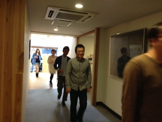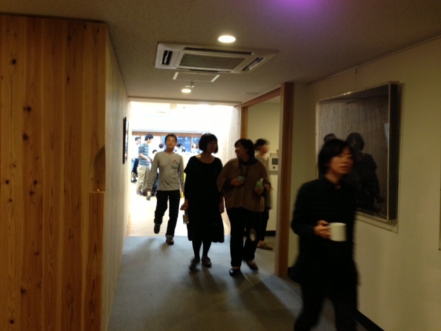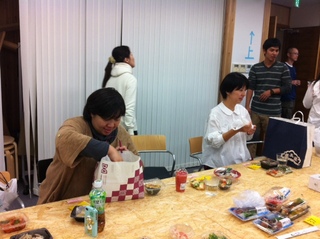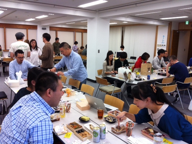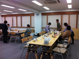 そろそろ食べようの掛け声が! みんなで大きな会議室に集合です。 |