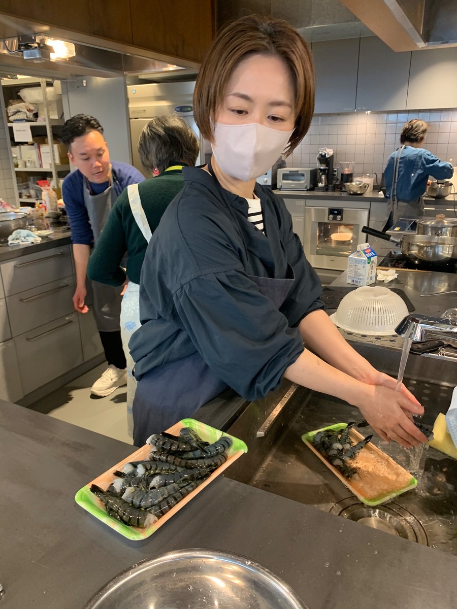 が洗っているのはピチピチのエビ。