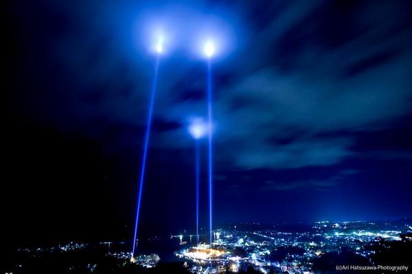 3月11日の気仙沼の夜空には3本の光の慰霊碑が立ち上がりました。