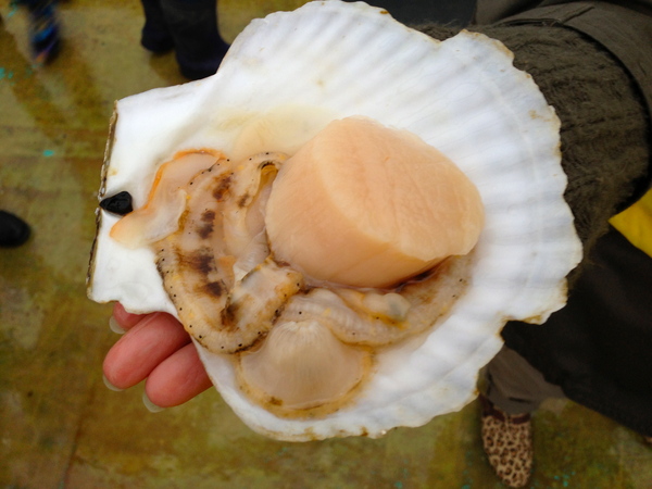 船で、牡蠣とホタテの養殖いかだのあるところまで乗せていただくのですが、