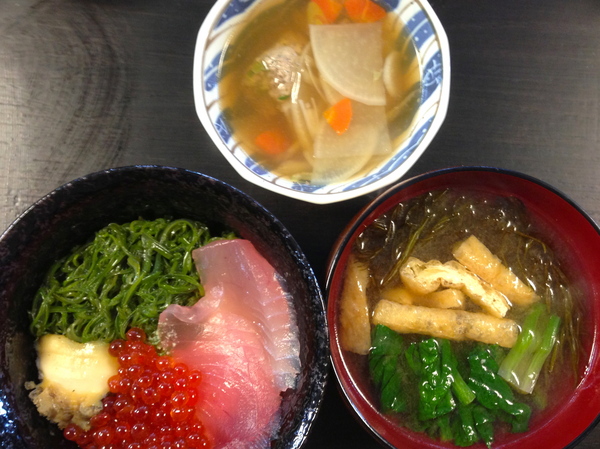 そしてさらに、出していただいたのが海鮮丼と、さんまのつみれ汁……。