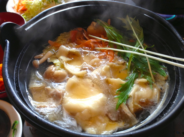お鍋に入れていただく「手ぎりはっと膳」と、