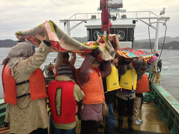 大漁旗で雨しのぎというのは、なかなか見ない光景ですね。