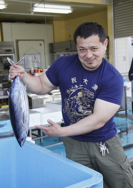 磯屋水産の安藤竜司さんに初カツオを持ってもらいました。