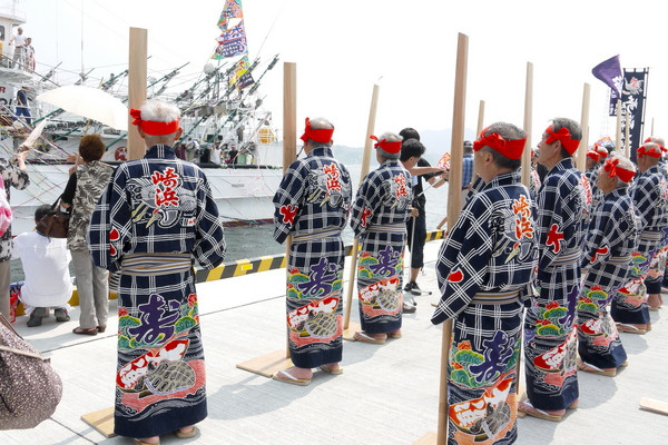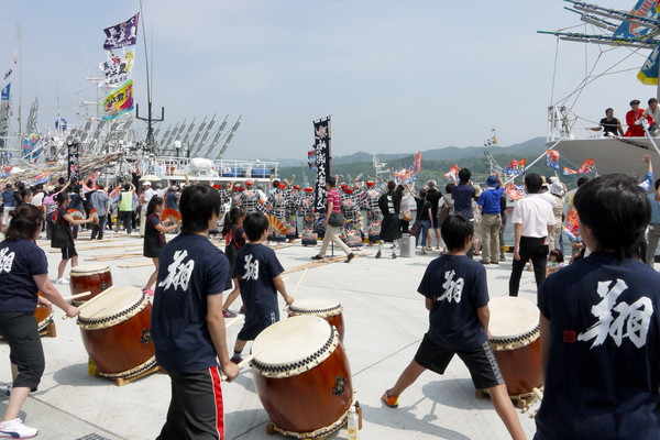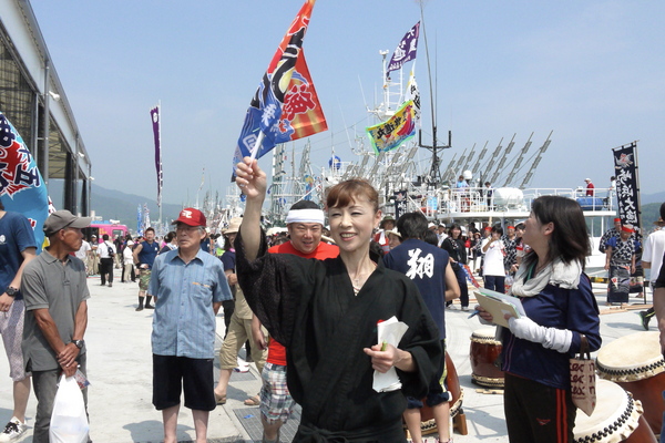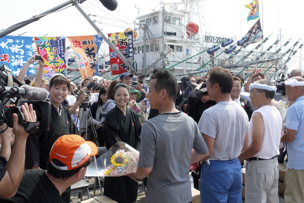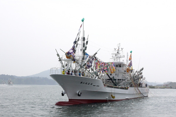 気仙沼湾から9隻のサンマ船が出港していきました。