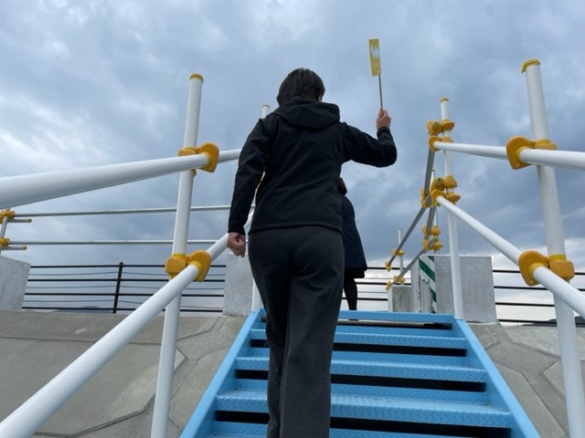 と、仮設のような階段を
