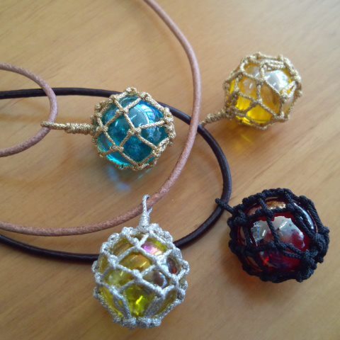その「びん玉」を、 実物に忠実に再現したネックレスが、 今気仙沼で、じわじわとブームです。 震災後、帆布を使った、 地名入りのバッグなどを作っている GANBAAREさんが、 新たにこのビン玉を使ったネックレスを製作! 漁師さんがビン玉にロープを編み込むように、 ひとつひとつ、丁寧に作られています。