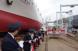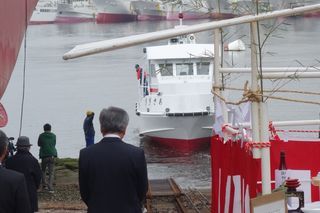 遠洋はえ縄船がつくられつつある 造船所の一角で、 関係者揃ってのテープカットで進水〜! 多くの関係者に見守られて出発しました。