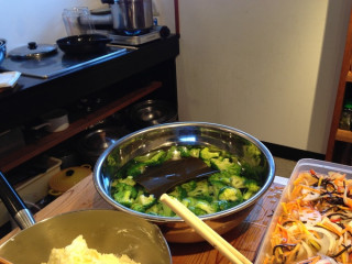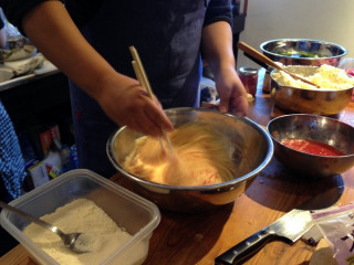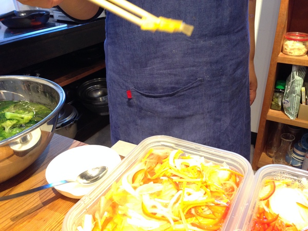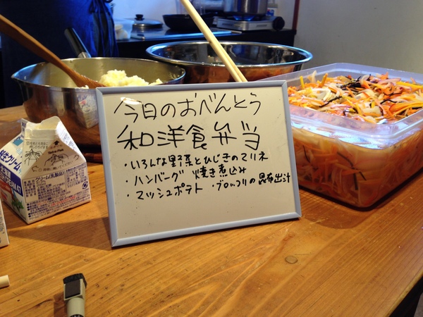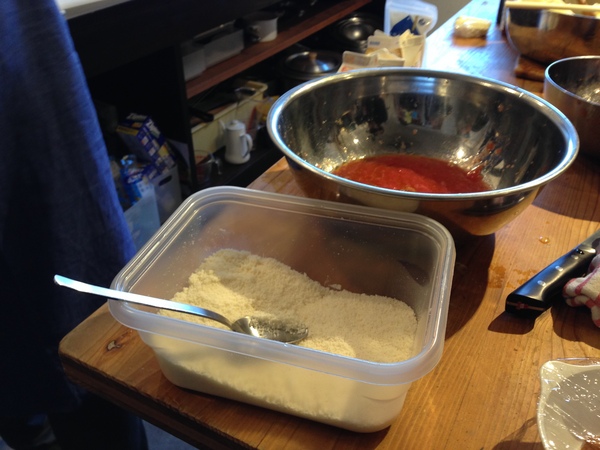 つぶした、うめぼし。 トマトピューレ (すりおろしとジュースだと思います)。 パルミジャーノチーズ。 オリーブオイル。 半分に折ってゆでたスパゲティに あえます。 おべんとうなので、このスパゲティは 伸びる前提でつくります。 だから、そんなに焦る必要はない。