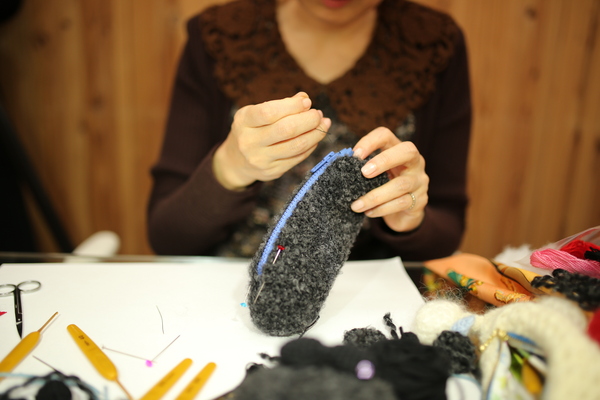 お裁縫は苦手なんです、 とおっしゃるタカモリさんですが (編みものに比べて、という意味で) まち針をうつところなんて、 とっても鮮やかでした。 |