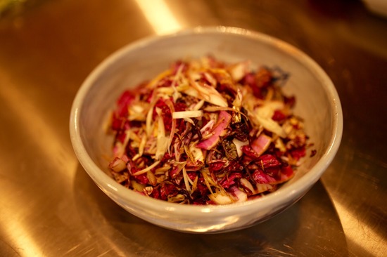一品、できあがっておりました。郡山のめずらしいムラサキ色の白菜を使った、「塩コンブと白菜の和え物」です。う、うまい。ミョウガが効いています。これは、あとを引くなぁ。白菜そのものも、そのままで、美味しいそうです。