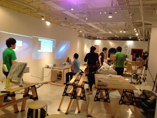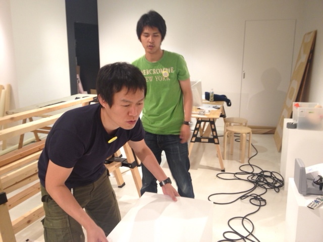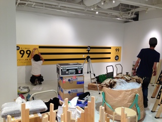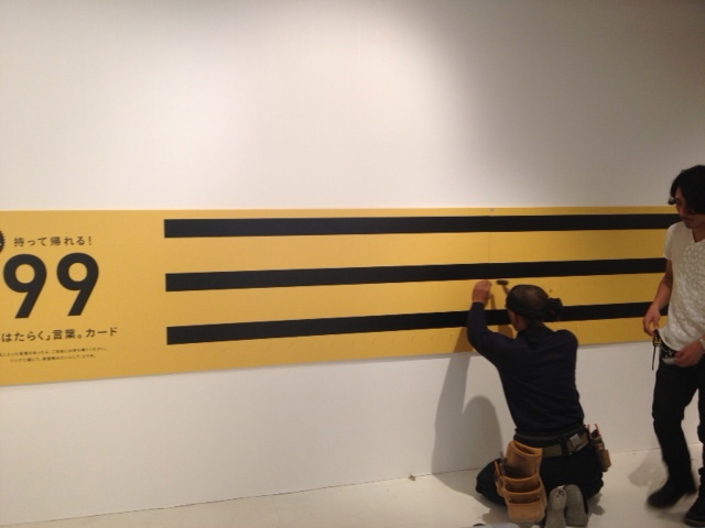 お、その裏側ではみなさんにお持ち帰りいただける 「99のことば」のカードを展示するための 土台が出来上がってきました。