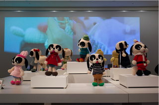 昨年、銀座三越で開催した 「タカモリ・トモコ全集」のときには 同じプロジェクターを「2台」つないで 写真2枚目のような あみぐるみムービーを映写したのですが 今回、これを3台にパワーアップ。