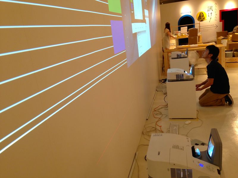 「99のはたらく言葉」ムービーは 3台のプロジェクターを同期させていて 「ものすごい横長」の映像を 出そうとしています。