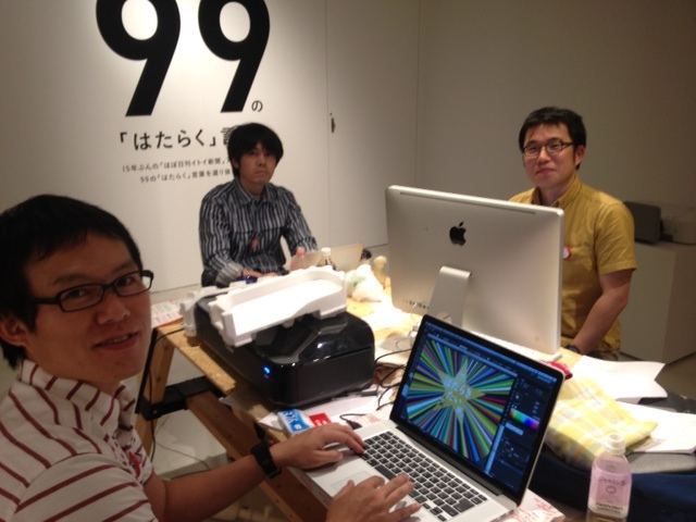 おっくん、べい、ぐっさんの同い年三人集が、 会場でばりばりと仕事をすすめている様が あまりに自然でおもしろかったので、 ここにご報告いたします。 |