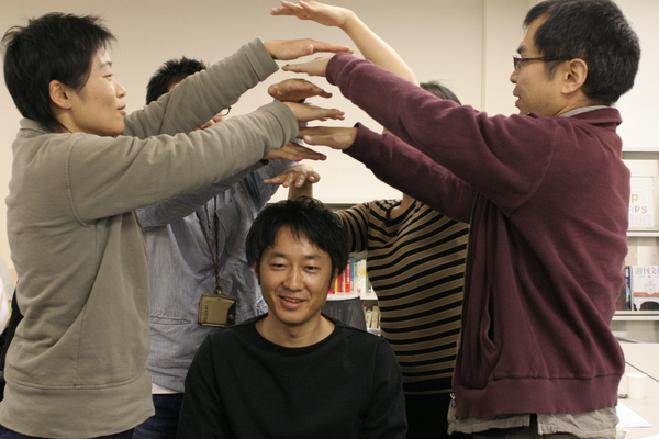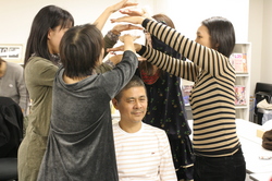 持ち上げられる人の頭の上に手をかざし、