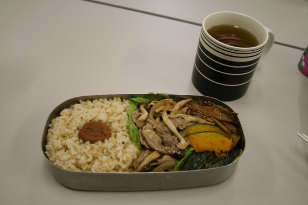 「玄米ご飯とキノコとお肉の炒めもの、