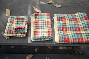 枕カバーにしたり、あるいは首にまいて
