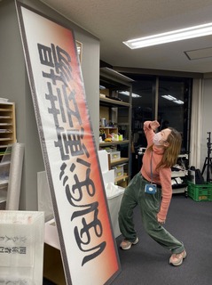デザイナーのに呼ばれて向かうと、そこには高さ2mを超える巨大な看板がありました。お、おおきい‥‥! これを、これからパルコに運びます。