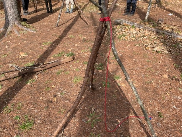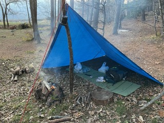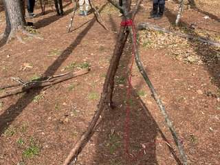 ブルーシートでつくる寝床のつくり方を教えてもらいました。