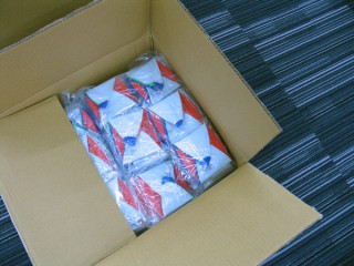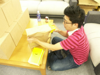 ささ、どうぞ、はじめてください。場所が場所、というか事務所なもので、はじまる瞬間もとても地味です。みずからバリバリと包装紙をやぶってはじめます・・・。「四時までにお願いしますね」今日中に発送担当の「アドレス通商」さんに届けなければいけないので、よろしくお願いします〜