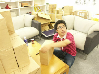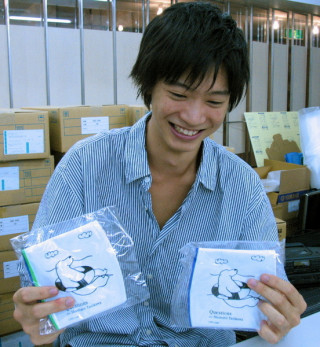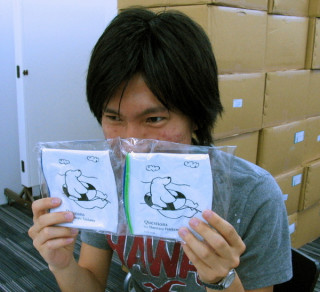 ダンボールのなかみはもちろん、7000個の『しろくまビーチボール』です。検品と配送作業を手伝ってくれるのは古株アルバイトのミッチー(写真2枚目)と新人アルバイトの井上君(写真3枚目)です。シャイな井上君に「はーい、笑って〜」とカメラを向けたところ「無理っす!」とマジで照れておりました。カメラを向けると条件反射的に面白ポーズをとる乗組員に見慣れていたので軽い衝撃です。ちなみに、古株ミッチーはまったく照れる様子はありません。