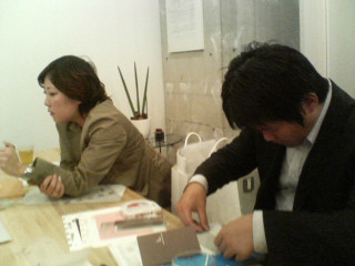 オプションのサンプルがあがってきたり、校正が戻ってきたりしています。「もし月曜日に修正が入ったら ピンチです」なんて話をしているのでかなり佳境です。写真手前はできあがりのイメージを確認するためにその場で工作をはじめるナメガヤさんです。最近サーフィンをはじめたそうです。奥はちゃきちゃきと校正をする部分について説明をするサイダさんです。「ムネキュンです」という言葉をトラブルの電話を受けたときに使ってしまう乙女な方です。