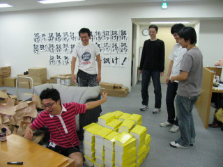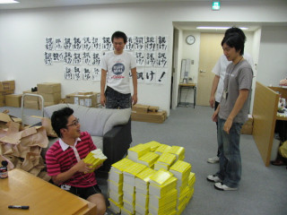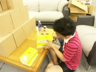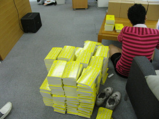 ミーティングを終えたとさてさて、は進んでいますかね?と、扉を開けたらなんか、増えてる!黄色い表紙のムダ話集が山と積まれています!